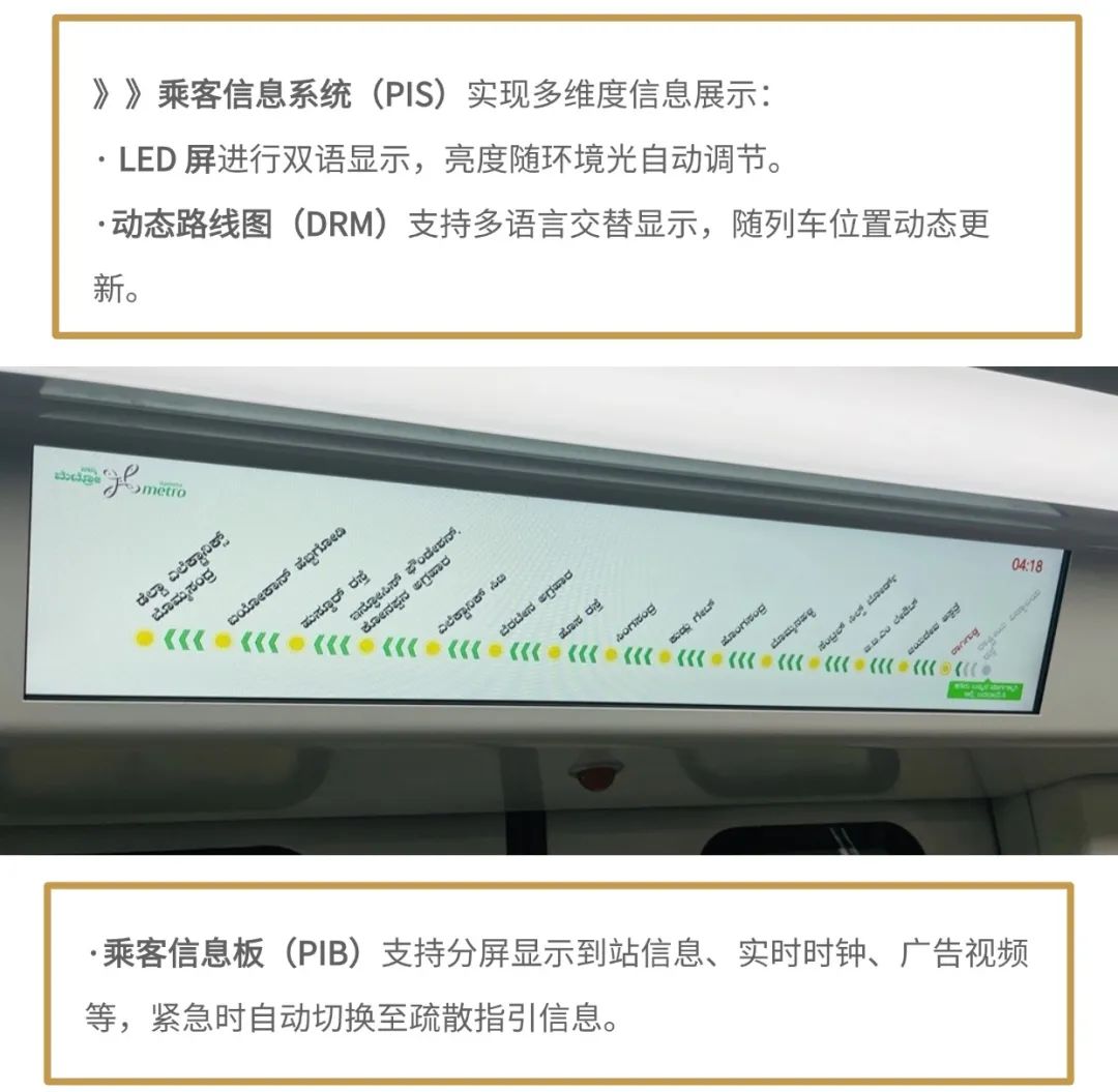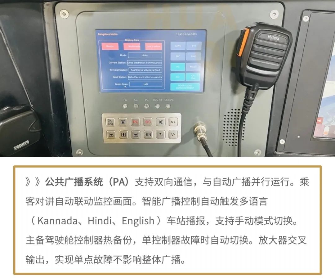 华启智能为班加罗尔二期项目提供的车载乘客信息系统方案,整体进行高可靠性设计,以应对复杂场景,子系统均采用冗余设计,确保单点故障不影响系统核心功能。覆盖广播通信、信息展示、安全监控等核心场景,通过创新技术集成与场景化应用,显著提升当地乘客出行体验。